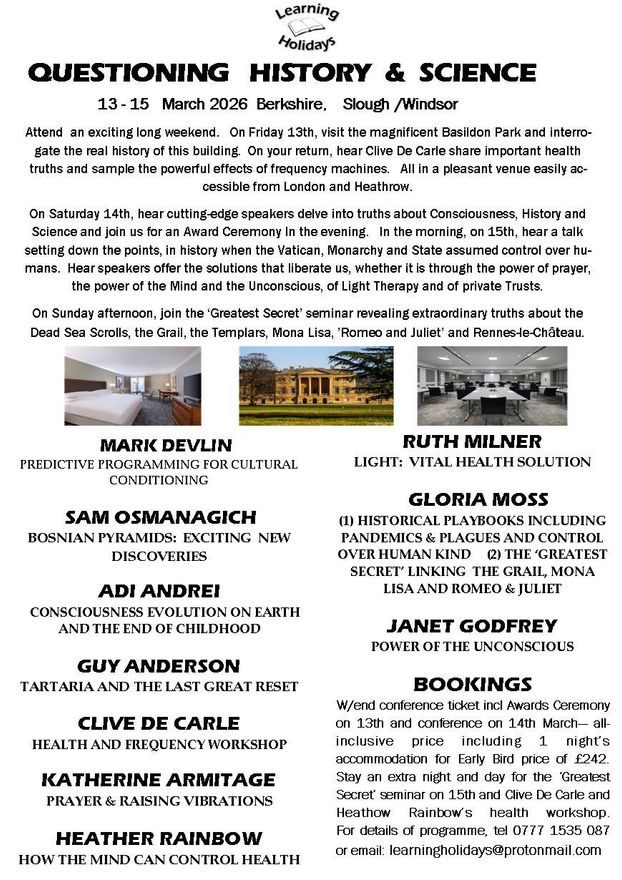We're organising an exciting event on 13-15 March 2026. Meet other Critical Thinkers and hear cutting-edge speakers quedtion mainstream History and Science. For more information, email our conference arm at: learningholidays@protonmail.com or phone 0777 1535 087