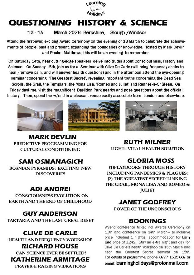 We're organising an exciting event on 13-15 March 2026. Meet other Critical Thinkers and hear cutting-edge speakers quedtion mainstream History and Science. For more information, email our conference arm at: learningholidays@protonmail.com or phone 0777 1535 087