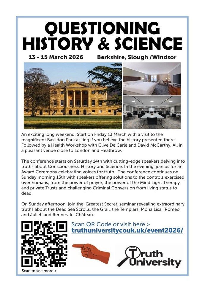 We bring together cutting-edge thinking on a range of topics in a location easily accessible from London, elsewhere in the country and overseas. For information concerning our exciting event on 13-15 March 2026, please contact us at: infotruthuniversity@protonmail.com or phone us on 0777 1535 087